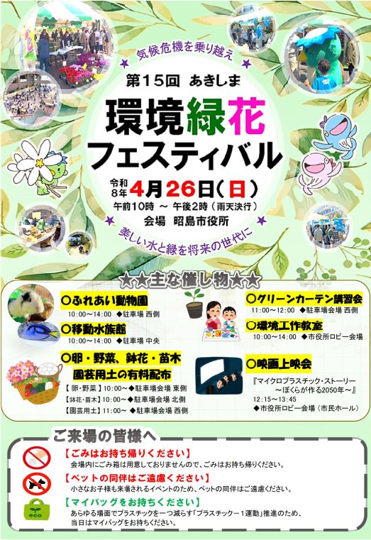 4月26日に昭島市役所にて「第15回あきしま環境緑花フェスティバル」が開催されます。