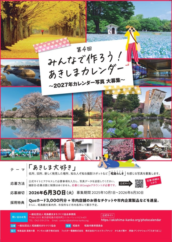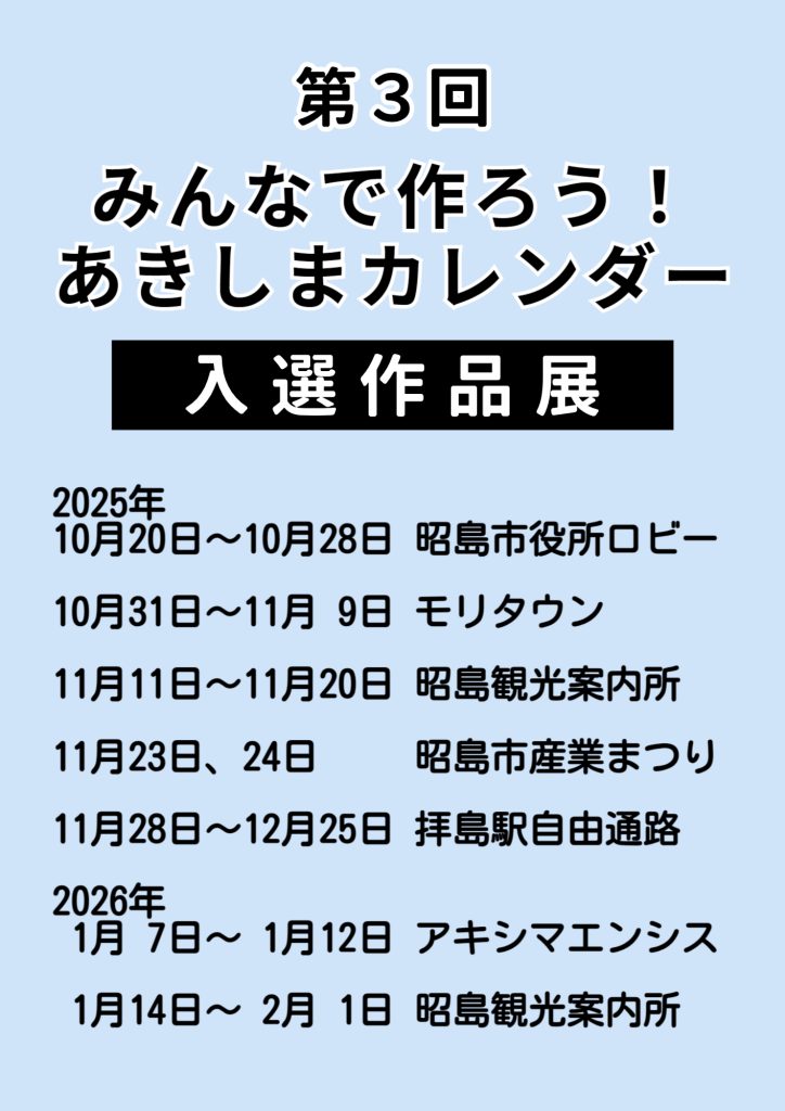 令和7年10月1日より「第4回みんなで作ろう!あきしまカレンダー」が開始しました。詳しくは当サイトの専用ページをご覧ください。