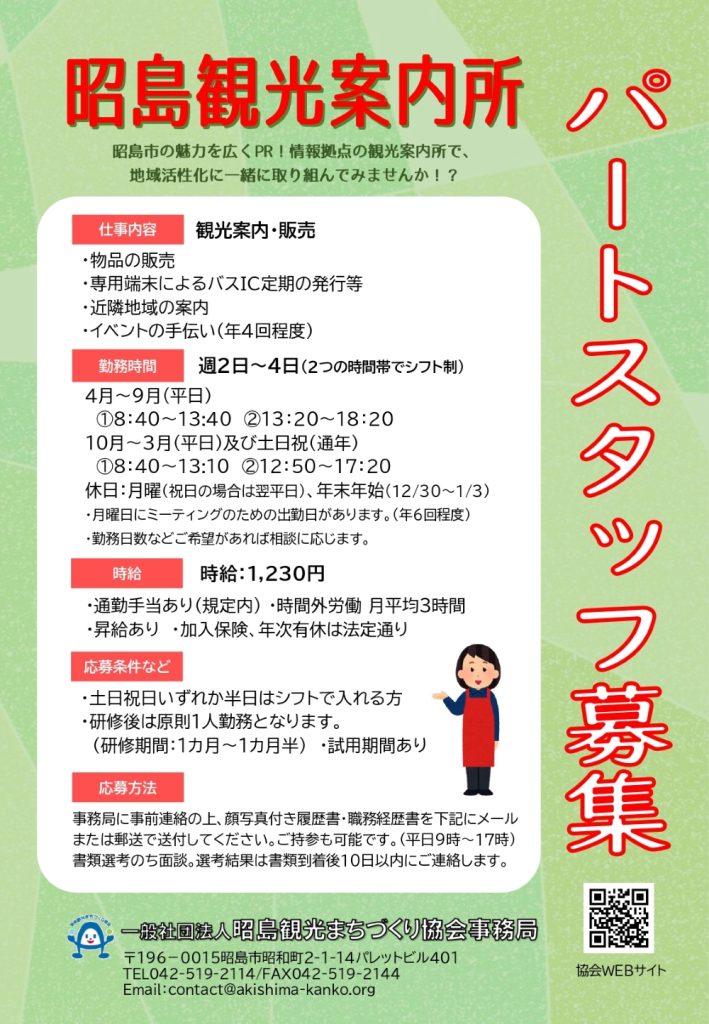 昭島観光まちづくり協会では、昭島市の自然や文化・産業などの魅力を広く発信し、地域の活性化を目指し取り組んでいます。その情報発信拠点である観光案内所のパート職員を募集しています。