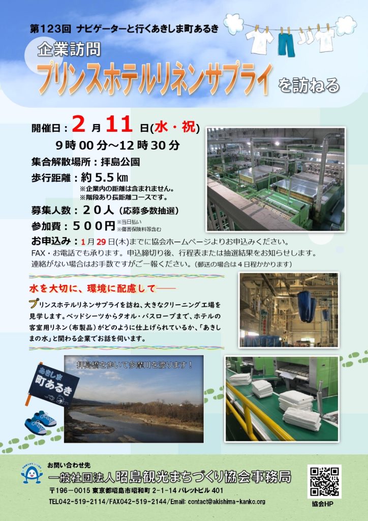 2月11日 第123回あきしま町あるき「企業訪問~プリンスホテルリネンサプライを訪ねる~」